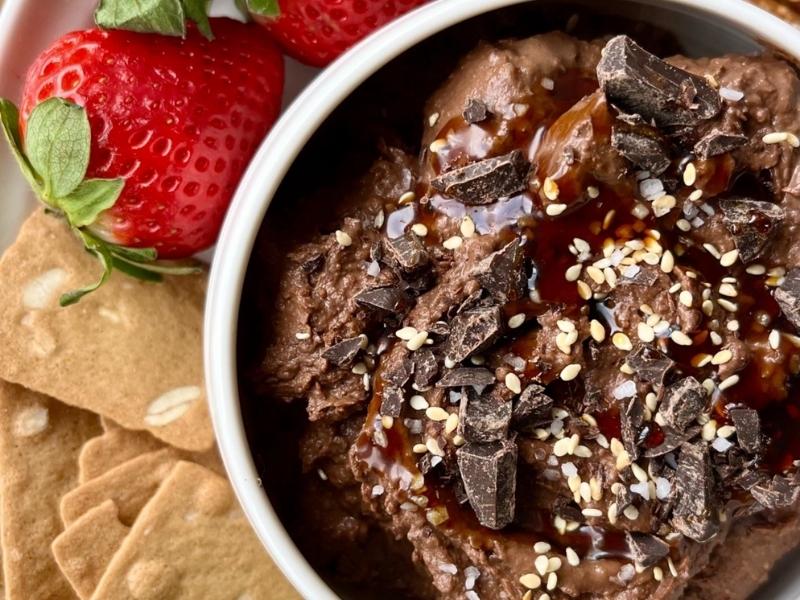 Plant protein based chocolate dip? Yes, please!! If you need an excuse to dip some fruit (or salty pretzels my fave) – this chocolate tahini hummus will be your new chocolatey staple.